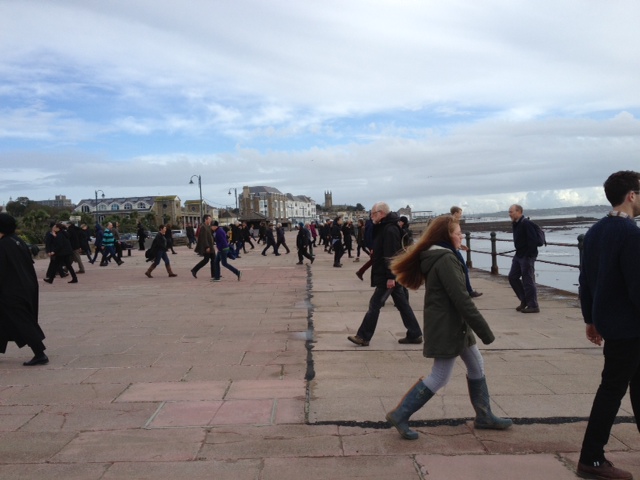 Participants in the Cornwall Workshop arrived in Kestle Barton, the arts centre near Helford which is hosting the workshop, on Friday evening, and attended a keynote talk by Hamish Fulton at Falmouth College. On Saturday, we took part in one of Fulton’s walks on the Western Promenade in Penzance. The promenade is paved with large slabs of sandstone, arranged in lines perpendicular to the coastline. 104 people took part in the walk, which consisted of each participant walking up and down one line of paving slabs. Walking to the sea, and away from the sea, to the sea, and away. Fulton was keen that we shouldn’t stop when we reached the end of our strip, but that we incorporate the turn as part of our walk and not break our pace. We were lined up in such a way that adjacent lines set off from opposite ends of the pavement, so that we began by walking towards each other, but very soon individual rhythms took over and the neatness of the group’s synchronised movement gave way to syncopation. We started at 11 o’clock sharp, by our own time devices, and stopped at noon. The walk took place in silence and Fulton requested that anyone starting the walk should finish it.