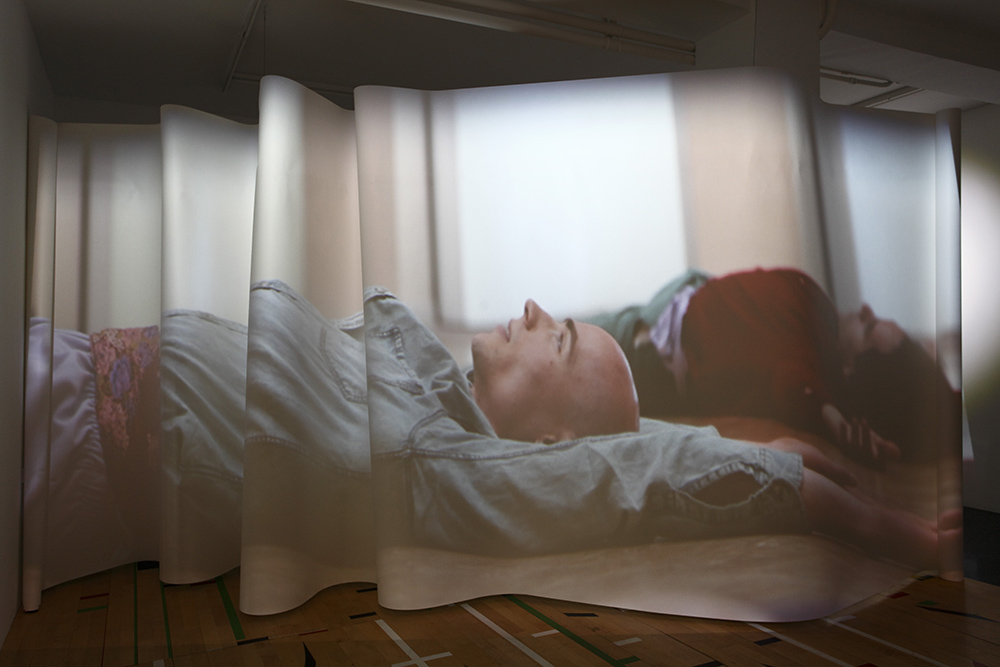 EMDW: The video is projected onto a large apparently freestanding undulating paper screen, which intensifies the sense of magic and illusion that pervades the exhibition. The movement of the screen also breaks up the projected image in a gentle but sometimes disorienting way, exactly as dreams break up normal imagery in the theatre of the unconscious into something that is hard to describe or to grasp. What is it about this fantastical state of not-quite-knowing that interests you?