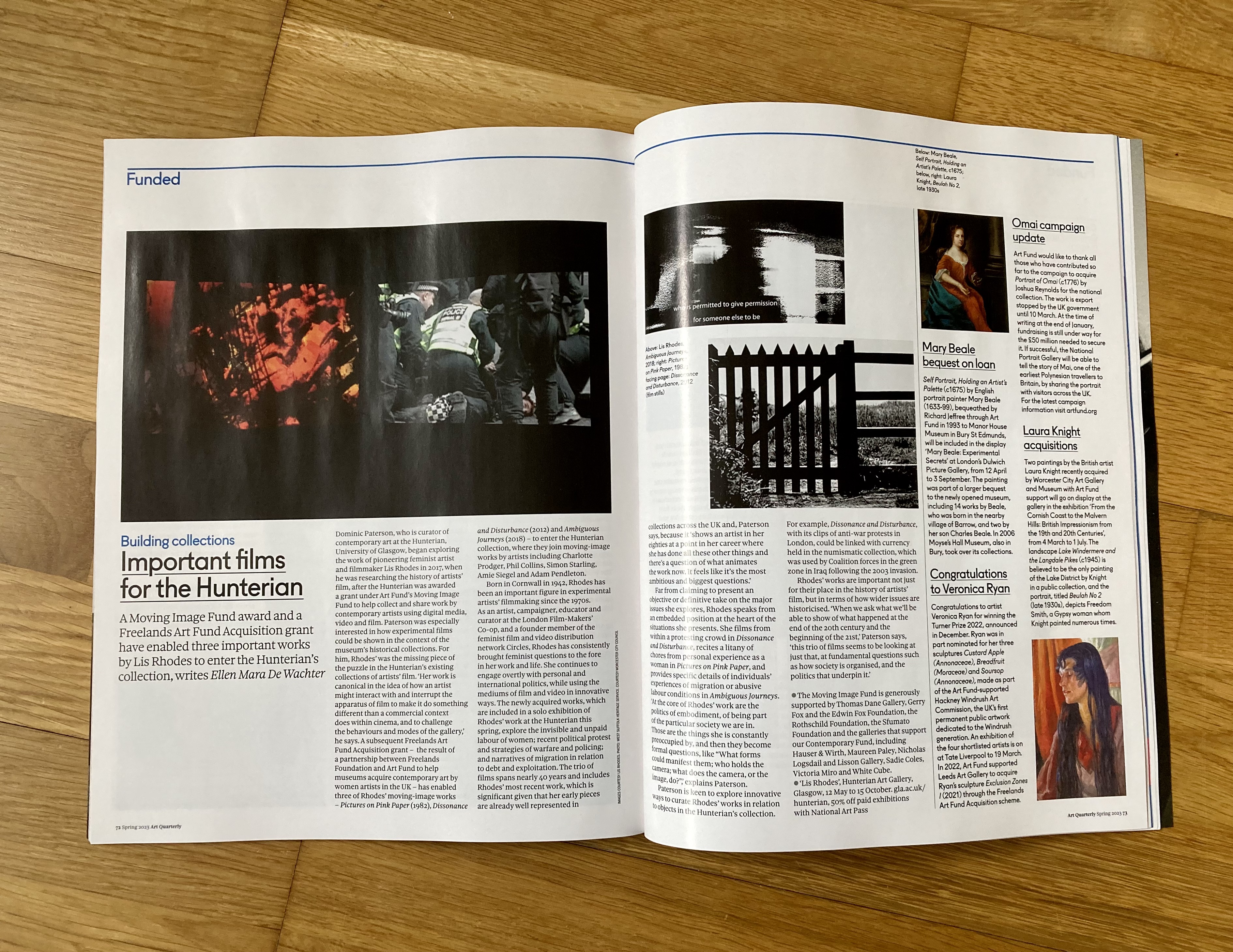 Article about the Hunterian Museum, Glasgow’s recent acquisition of films by Lis Rhodes, for Art Quarterly, Spring 2023