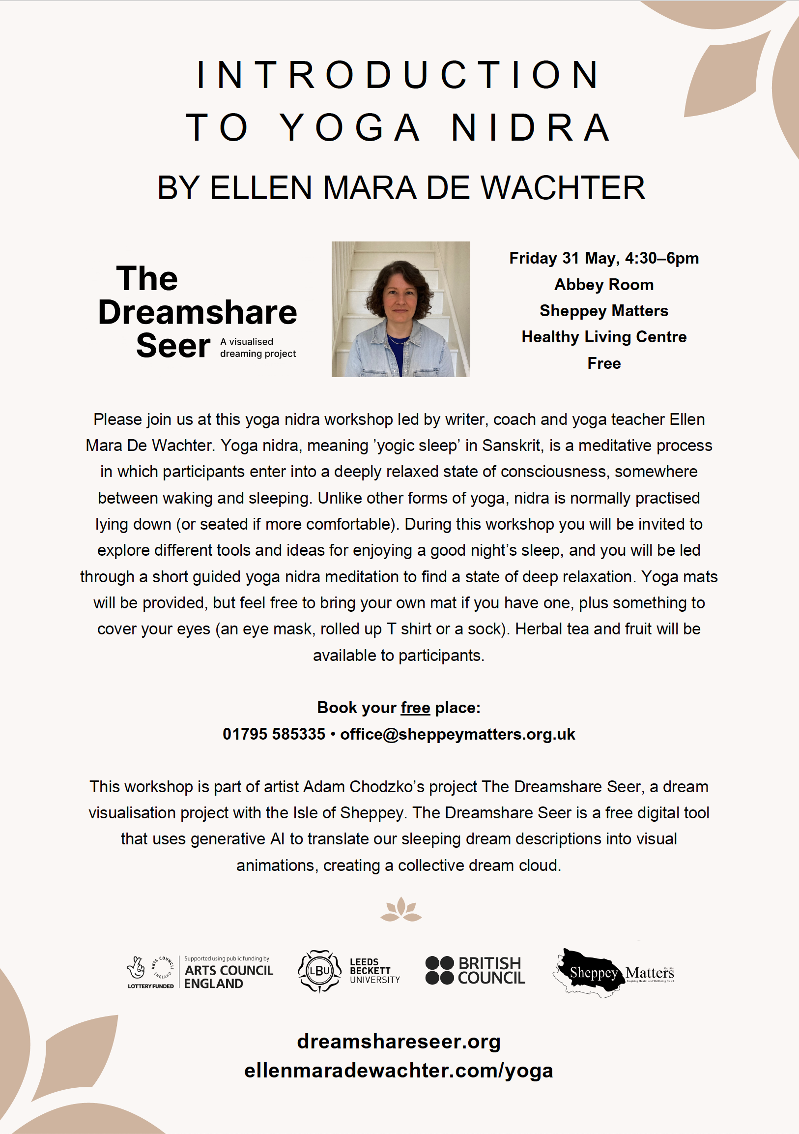 I have written a yoga nidra meditation as part of artist Adam Chodzko’s project, The Dreamshare Seer, a free digital tool that uses generative AI to translate our sleeping dream descriptions into visual animations, creating a collective dream cloud.